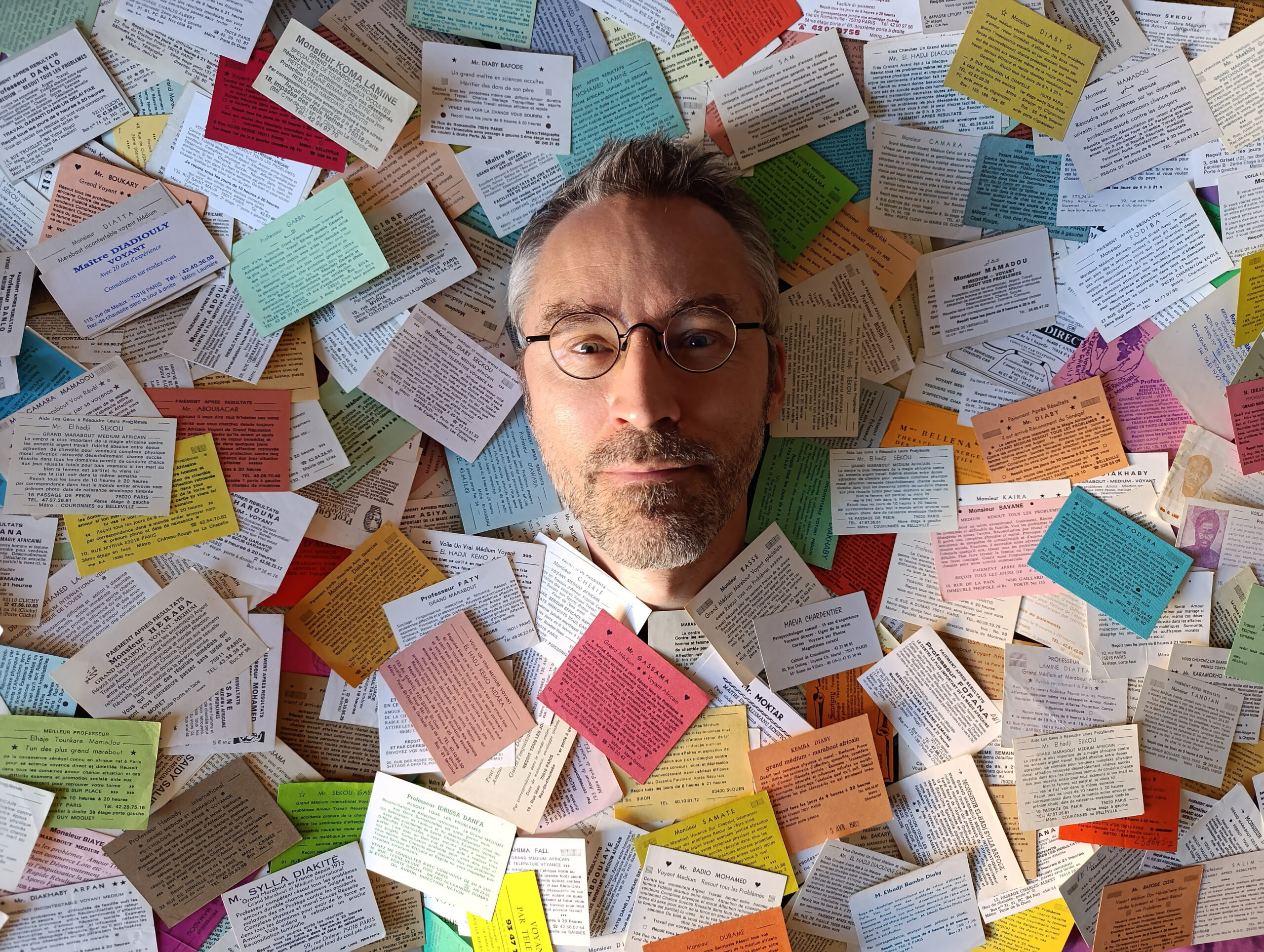 Denis Rionnet est un passionné de « littérature maraboutique », ces flyers qui vantent les mérites de marabouts. Il en a fait un