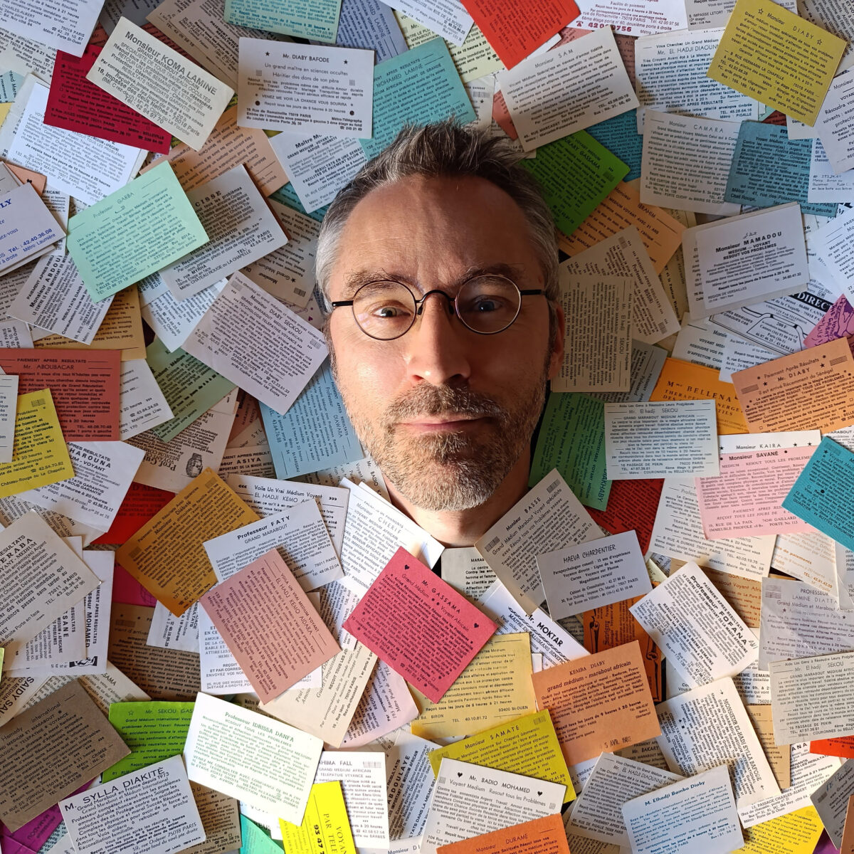 Pour que la boucle soit bouclée, pour que le prospectus de guérisseur revienne au format qui l’a vu naître – le papier, donc –, il faudrait selon Denis Rionnet en faire un livre. L’inscrire noir sur blanc. « Qu’on puisse avoir chez soi un bouquin sur les flyers de marabouts, à mettre dans sa bibliothèque… Un retour à l’imprimé. »